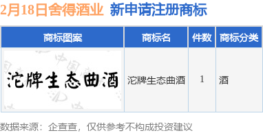 今年以来舍得酒业股份有限公司新申请注册商标19件,截止目前公司共持有注册商标3529件,另有431件商标尚在注册申请中。