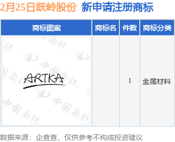 今年以来浙江跃岭股份有限公司新申请注册商标1件,截止目前公司共持有注册商标86件,另有6件商标尚在注册申请中。