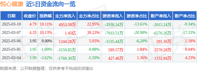 3月10日的资金流向数据方面,主力资金净流入4953.58万元,占总成交额22.95%,游资资金净流出2938.34万元,占总成交额13.61%,散户资金净流出2015.24万元,占总成交额9.34%。