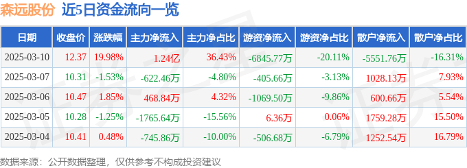 3月10日的资金流向数据方面,主力资金净流入1.24亿元,占总成交额36.43%,游资资金净流出6845.77万元,占总成交额20.11%,散户资金净流出5551.76万元,占总成交额16.31%。