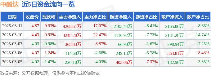 3月11日的资金流向数据方面,主力资金净流入4268.51万元,占总成交额17.07%,游资资金净流出2103.44万元,占总成交额8.41%,散户资金净流出2165.06万元,占总成交额8.66%。