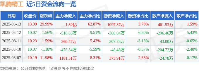 3月13日的资金流向数据方面,主力资金净流入1.82亿元,占总成交额62.87%,游资资金净流入1097.87万元,占总成交额3.78%,散户资金净流入461.53万元,占总成交额1.59%。