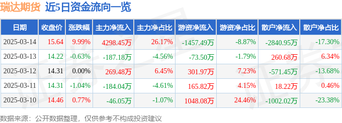 3月14日的资金流向数据方面,主力资金净流入4298.45万元,占总成交额26.17%,游资资金净流出1457.49万元,占总成交额8.87%,散户资金净流出2840.95万元,占总成交额17.3%。