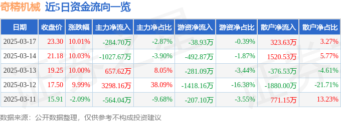 3月17日的资金流向数据方面,主力资金净流出284.7万元,占总成交额2.87%,游资资金净流出38.93万元,占总成交额0.39%,散户资金净流入323.63万元,占总成交额3.27%。