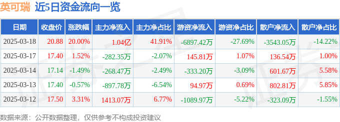 3月18日的资金流向数据方面,主力资金净流入1.04亿元,占总成交额41.91%,游资资金净流出6897.42万元,占总成交额27.69%,散户资金净流出3543.05万元,占总成交额14.22%。