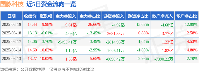3月19日的资金流向数据方面,主力资金净流入9.61亿元,占总成交额26.66%,游资资金净流出4.92亿元,占总成交额13.67%,散户资金净流出4.68亿元,占总成交额12.99%。
