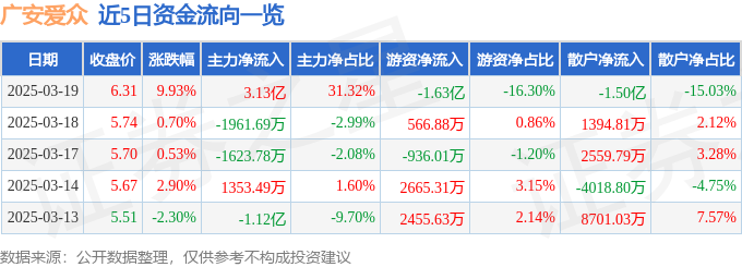 3月19日的资金流向数据方面,主力资金净流入3.13亿元,占总成交额31.32%,游资资金净流出1.63亿元,占总成交额16.3%,散户资金净流出1.5亿元,占总成交额15.03%。