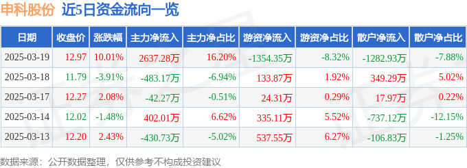 3月19日的资金流向数据方面,主力资金净流入2637.28万元,占总成交额16.2%,游资资金净流出1354.35万元,占总成交额8.32%,散户资金净流出1282.93万元,占总成交额7.88%。
