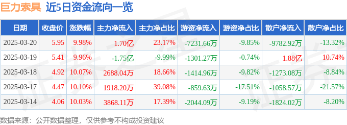 近5日资金流向一览见下表: