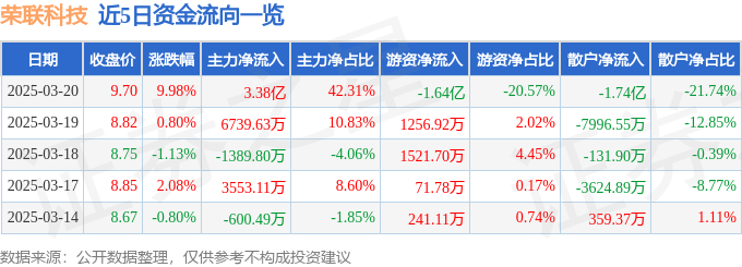3月20日的资金流向数据方面,主力资金净流入3.38亿元,占总成交额42.31%,游资资金净流出1.64亿元,占总成交额20.57%,散户资金净流出1.74亿元,占总成交额21.74%。