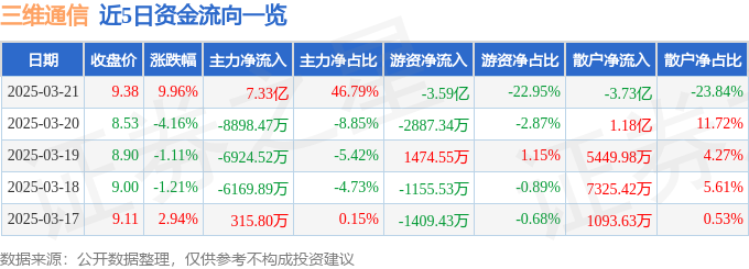 3月21日的资金流向数据方面,主力资金净流入7.33亿元,占总成交额46.79%,游资资金净流出3.59亿元,占总成交额22.95%,散户资金净流出3.73亿元,占总成交额23.84%。