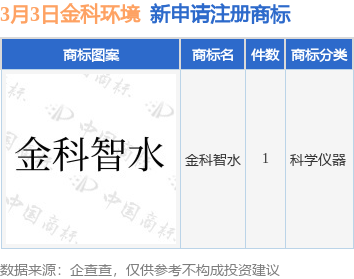 今年以来金科环境股份有限公司新申请注册商标2件,截止目前公司共持有注册商标208件,另有90件商标尚在注册申请中。