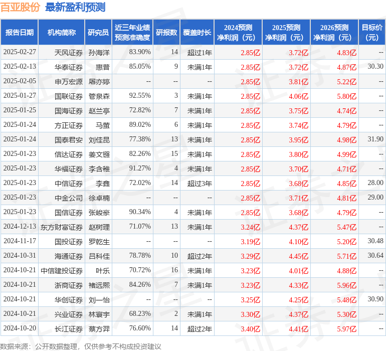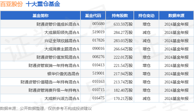 持有百亚股份最多的基金为财通资管价值成长混合A,目前规模为15.18亿元,最新净值2.064(3月21日),较上一交易日下跌1.22%,近一年上涨16.2%。该基金现任基金经理为姜永明。