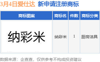 今年以来爱仕达股份有限公司新申请注册商标1件,截止目前公司共持有注册商标724件,另有35件商标尚在注册申请中。