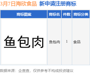 今年以来海欣食品股份有限公司新申请注册商标21件,截止目前公司共持有注册商标463件,另有70件商标尚在注册申请中。