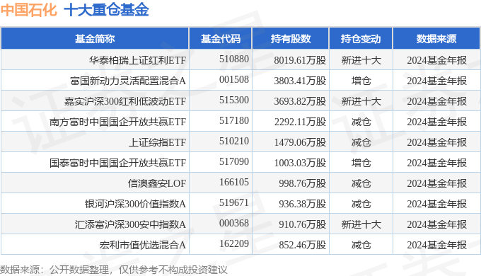 持有中国石化最多的基金为华泰柏瑞上证红利ETF,目前规模为233.99亿元,最新净值3.0762(3月24日),较上一交易日上涨0.75%,近一年上涨4.37%。该基金现任基金经理为柳军 李茜。
