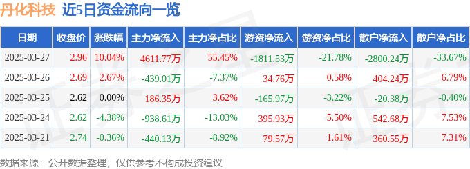 3月27日的资金流向数据方面,主力资金净流入4611.77万元,占总成交额55.45%,游资资金净流出1811.53万元,占总成交额21.78%,散户资金净流出2800.24万元,占总成交额33.67%。