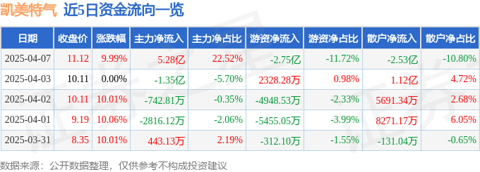 4月7日的资金流向数据方面,主力资金净流入5.28亿元,占总成交额22.52%,游资资金净流出2.75亿元,占总成交额11.72%,散户资金净流出2.53亿元,占总成交额10.8%。
