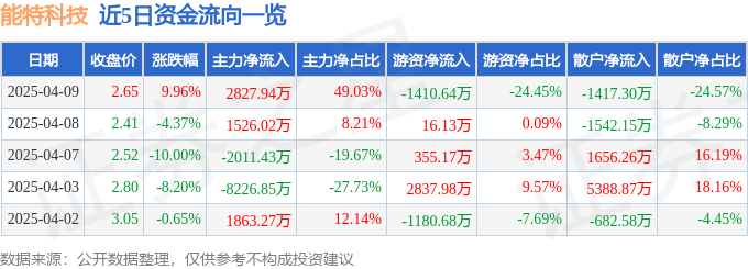 4月9日的资金流向数据方面,主力资金净流入2827.94万元,占总成交额49.03%,游资资金净流出1410.64万元,占总成交额24.45%,散户资金净流出1417.3万元,占总成交额24.57%。