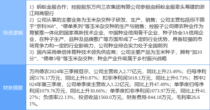 该股为蚂蚁集团概念股,乡村振兴,大农业概念热股,当日蚂蚁集团概念股概念上涨3.59%,乡村振兴概念上涨2.42%,大农业概念上涨1.47%。