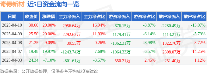 4月10日的资金流向数据方面,主力资金净流入2956.64万元,占总成交额16.94%,游资资金净流出676.15万元,占总成交额3.87%,散户资金净流出2280.49万元,占总成交额13.07%。