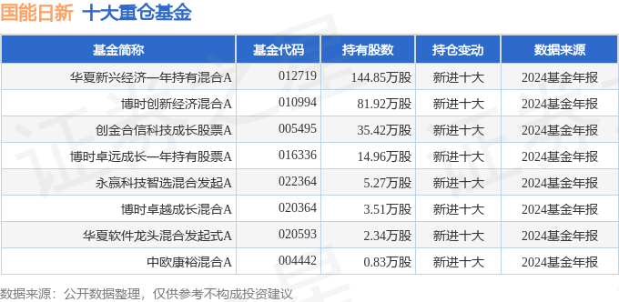 持有国能日新最多的基金为华夏新兴经济一年持有混合A,目前规模为13.77亿元,最新净值0.8843(4月11日),较上一交易日上涨1.16%,近一年下跌0.97%。该基金现任基金经理为孙轶佳。