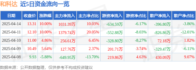 4月14日的资金流向数据方面,主力资金净流入1031.39万元,占总成交额10.03%,游资资金净流出634.59万元,占总成交额6.17%,散户资金净流出396.8万元,占总成交额3.86%。