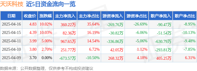4月16日的资金流向数据方面,主力资金净流入360.22万元,占总成交额35.64%,游资资金净流出269.76万元,占总成交额26.69%,散户资金净流出90.47万元,占总成交额8.95%。