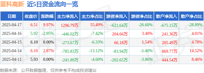 4月17日的资金流向数据方面,主力资金净流入1296.79万元,占总成交额55.49%,游资资金净流出621.64万元,占总成交额26.6%,散户资金净流出675.15万元,占总成交额28.89%。