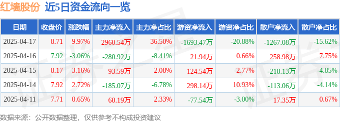 4月17日的资金流向数据方面,主力资金净流入2960.54万元,占总成交额36.5%,游资资金净流出1693.47万元,占总成交额20.88%,散户资金净流出1267.08万元,占总成交额15.62%。