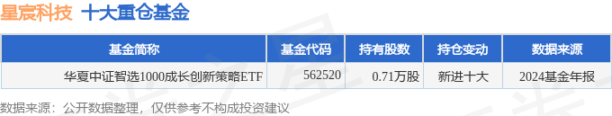 持有星宸科技最多的基金为华夏中证智选1000成长创新策略ETF,目前规模为0.5亿元,最新净值1.0108(4月18日),较上一交易日下跌0.17%,近一年上涨14.8%。该基金现任基金经理为严筱娴。