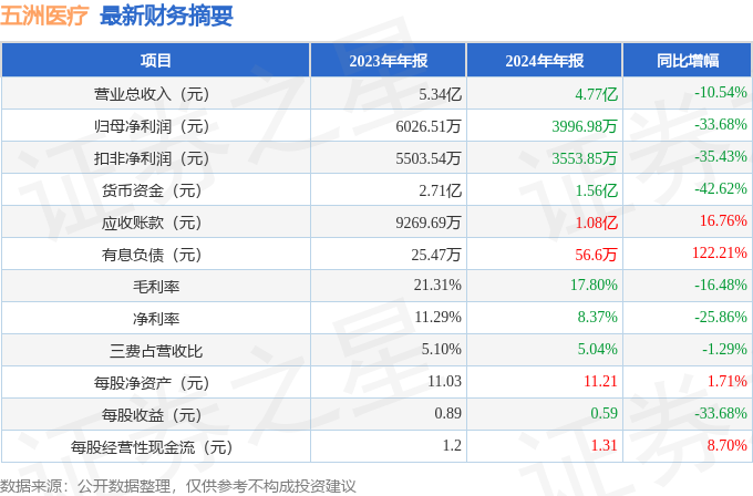 据证券之星公开数据整理,近期五洲医疗(301234)发布2024年年报。截至本报告期末,公司营业总收入4.77亿元,同比下降10.54%,归母净利润3996.98万元,同比下降33.68%。按单季度数据看,第四季度营业总收入1.35亿元,同比上升13.28%,第四季度归母净利润563.45万元,同比下降9.4%。本报告期五洲医疗公司应收账款体量较大,当期应收账款占最新年报归母净利润比达270.79%。