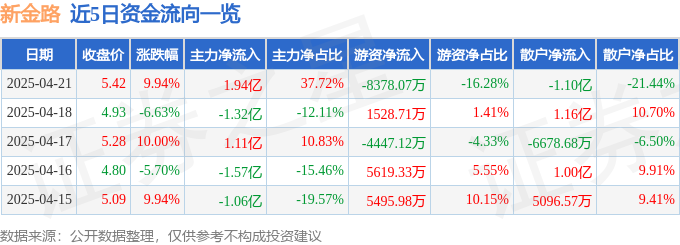 4月21日的资金流向数据方面,主力资金净流入1.94亿元,占总成交额37.72%,游资资金净流出8378.07万元,占总成交额16.28%,散户资金净流出1.1亿元,占总成交额21.44%。