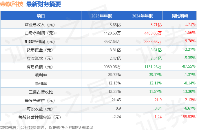 本次财报公布的各项数据指标表现尚佳。其中,毛利率39.17%,同比减1.37%,净利率12.11%,同比减0.14%,销售费用、管理费用、财务费用总计4291.34万元,三费占营收比11.57%,同比减13.3%,每股净资产21.9元,同比增2.13%,每股经营性现金流1.24元,同比增155.53%,每股收益0.84元,同比减6.67%