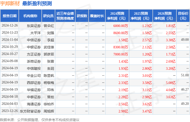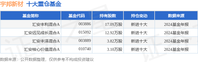 持有宇邦新材最多的基金为汇安丰利混合A,目前规模为0.54亿元,最新净值1.356(4月21日),较上一交易日上涨3.09%,近一年下跌5.39%。该基金现任基金经理为陆丰。