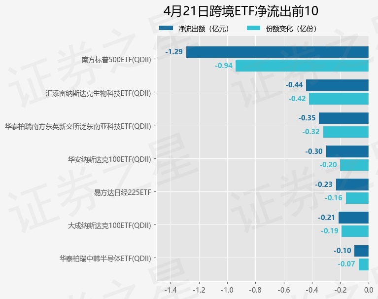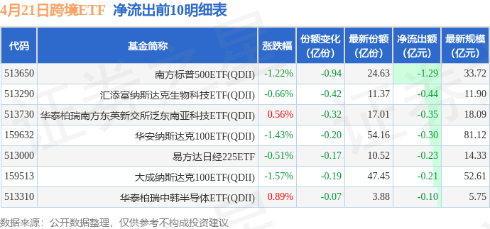 当日有7只跨境ETF基金出现资金净流出,其中净流出排首位的是南方标普500ETF(QDII)(513650),份额减少了9400.0万份,净流出额为1.29亿元。