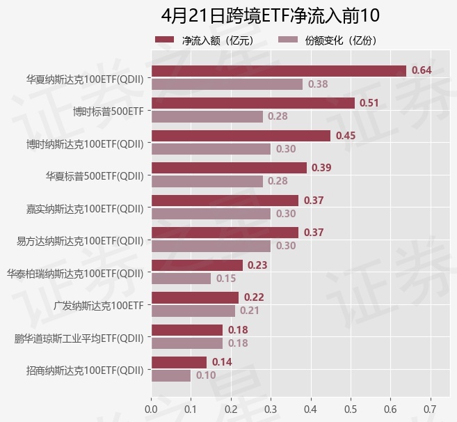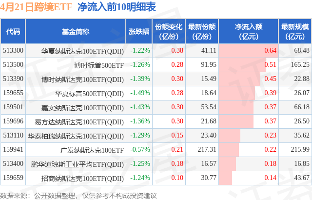 当日有18只跨境ETF基金出现资金净流入,其中净流入排首位的是华夏纳斯达克100ETF(QDII)(513300),份额增加了3750.0万份,净流入额为6398.86万元。