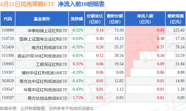 当日有9只风格策略ETF基金出现资金净流入,其中净流入排首位的是华泰柏瑞上证红利ETF(510880),份额增加了1450.0万份,净流入额为4461.75万元。