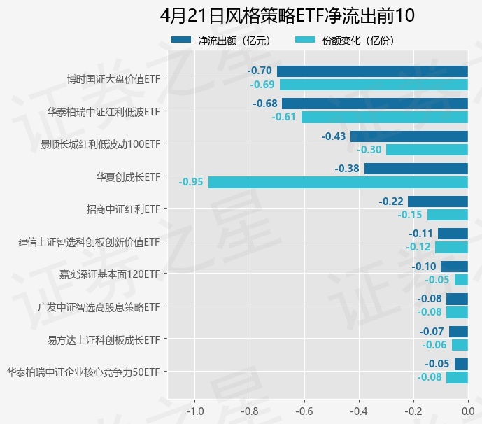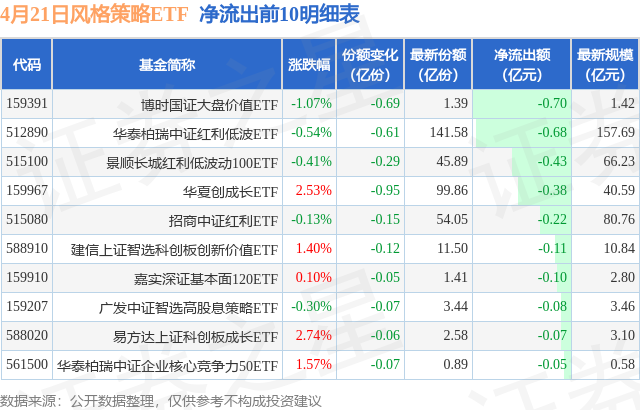当日有23只风格策略ETF基金出现资金净流出,其中净流出排首位的是博时国证大盘价值ETF(159391),份额减少了6900.0万份,净流出额为7045.2万元。