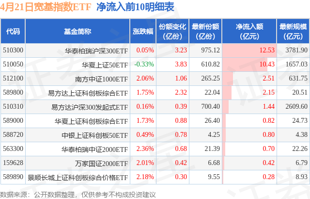 当日有47只宽基指数ETF基金出现资金净流入,其中净流入排首位的是华泰柏瑞沪深300ETF(510300),份额增加了3.23亿份,净流入额为12.53亿元。