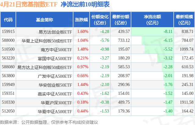 当日有105只宽基指数ETF基金出现资金净流出,其中净流出排首位的是易方达创业板ETF(159915),份额减少了4.28亿份,净流出额为8.11亿元。