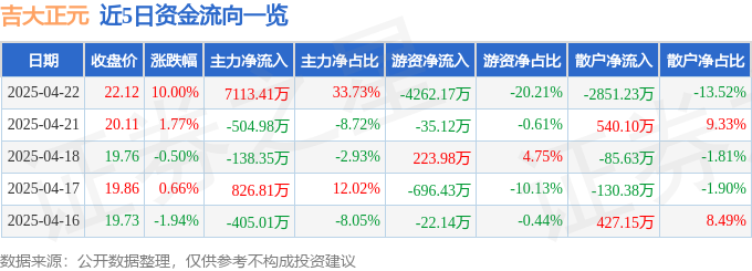 4月22日的资金流向数据方面,主力资金净流入7113.41万元,占总成交额33.73%,游资资金净流出4262.17万元,占总成交额20.21%,散户资金净流出2851.23万元,占总成交额13.52%。