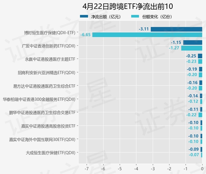 当日有21只跨境ETF基金出现资金净流出,其中净流出排首位的是博时恒生医疗保健(QDII-ETF)(513060),份额减少了6.65亿份,净流出额为3.11亿元。
