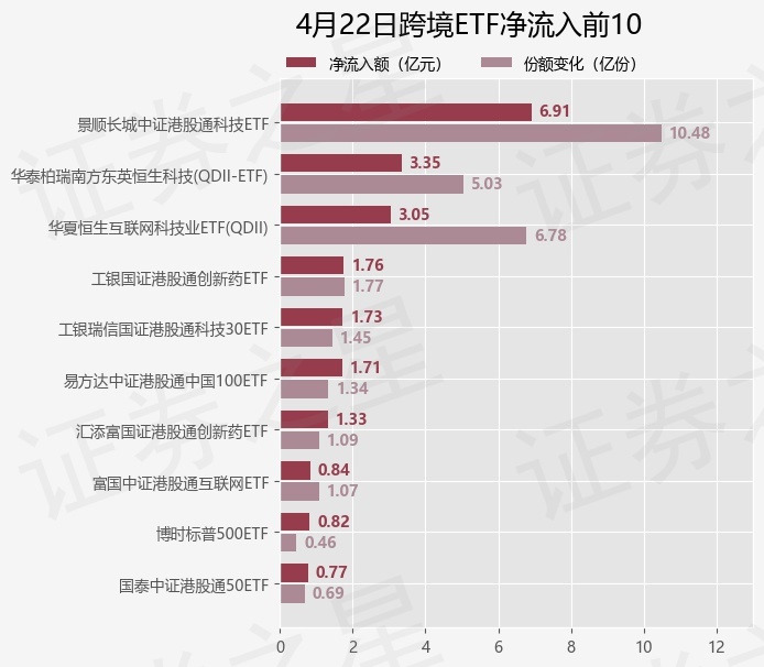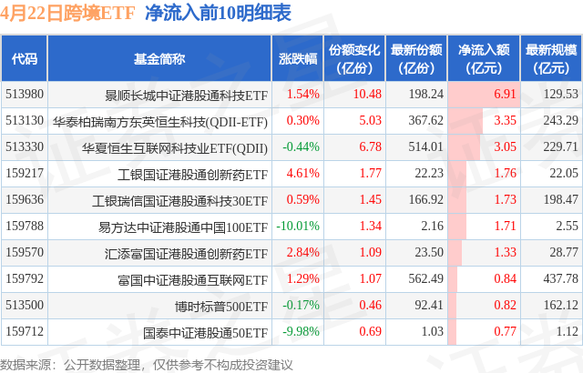 当日有76只跨境ETF基金出现资金净流入,其中净流入排首位的是景顺长城中证港股通科技ETF(513980),份额增加了10.48亿份,净流入额为6.91亿元。