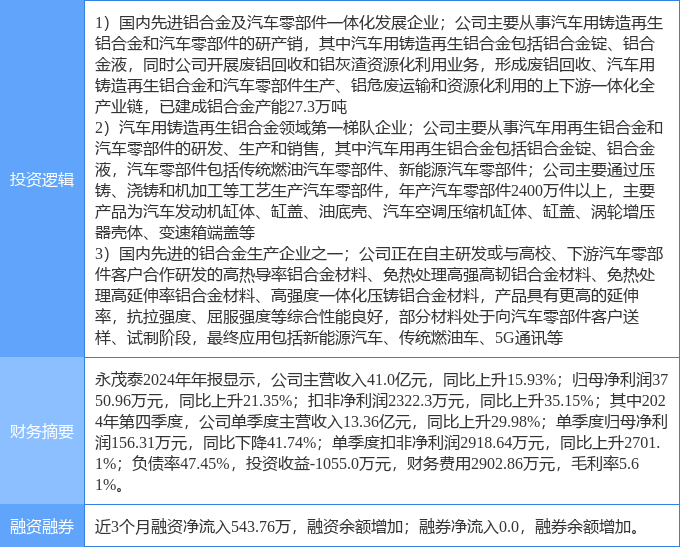 该股为一体化压铸,汽车零部件,有色 · 铝概念热股,当日一体化压铸概念上涨3.97%,汽车零部件概念上涨3.79%,有色 · 铝概念上涨2.01%。