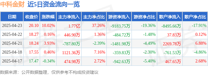 4月23日的资金流向数据方面,主力资金净流入1.77亿元,占总成交额37.26%,游资资金净流出9183.75万元,占总成交额19.36%,散户资金净流出8495.66万元,占总成交额17.91%。