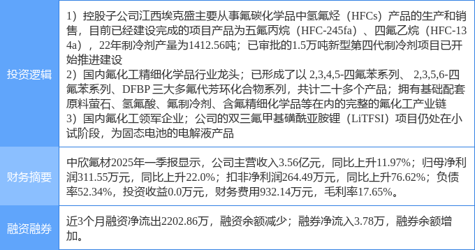 该股为固态电池,制冷剂,氟化工概念热股,当日固态电池概念上涨1.49%,制冷剂概念上涨1.32%,氟化工概念上涨1.25%。