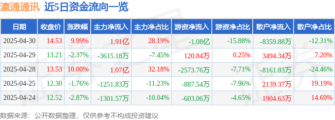 4月30日的资金流向数据方面,主力资金净流入1.91亿元,占总成交额28.19%,游资资金净流出1.08亿元,占总成交额15.88%,散户资金净流出8359.88万元,占总成交额12.31%。
