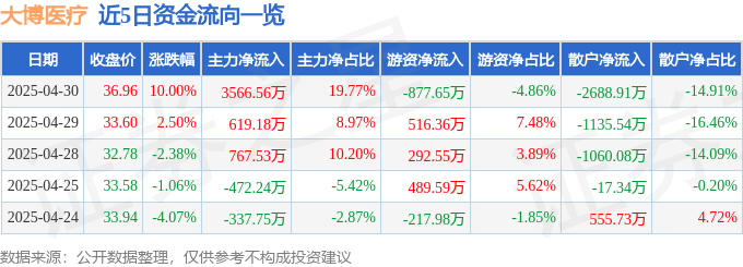 4月30日的资金流向数据方面,主力资金净流入3566.56万元,占总成交额19.77%,游资资金净流出877.65万元,占总成交额4.86%,散户资金净流出2688.91万元,占总成交额14.91%。
