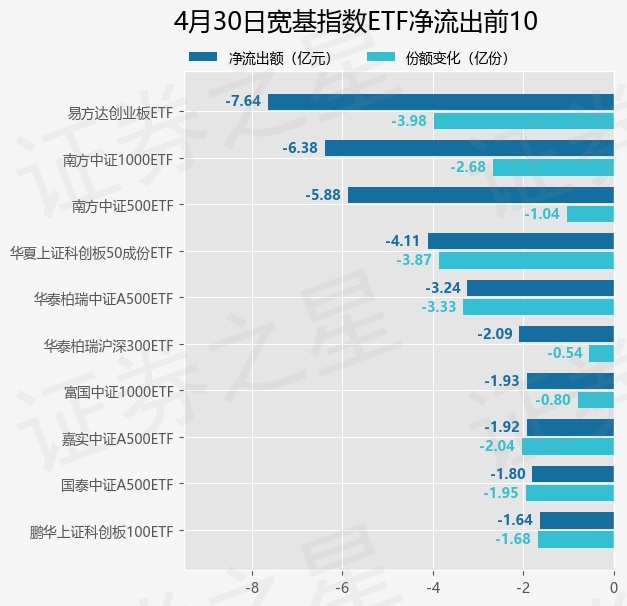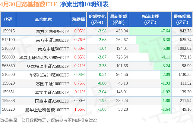 当日有130只宽基指数ETF基金出现资金净流出,其中净流出排首位的是易方达创业板ETF(159915),份额减少了3.98亿份,净流出额为7.64亿元。